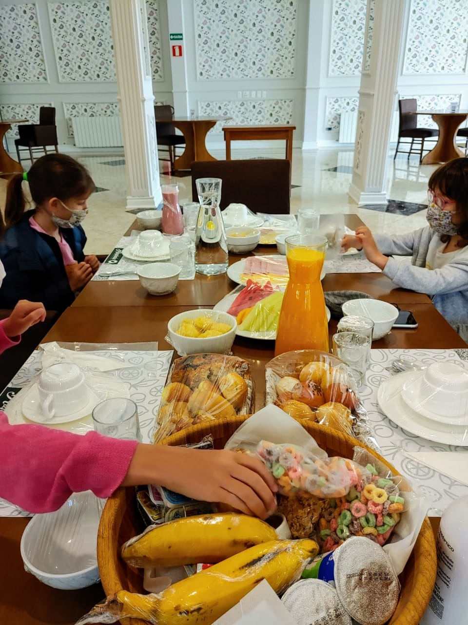 No restaurante, todas as louças e talheres são esterilizados e embalados com papel filme. Tivemos um completo e delicioso café da manhã que é montado na mesa, a mesma que é usada durante toda a estadia do hóspede.